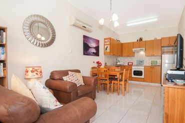 This attractive and bright ground floor apartment has 50 sq.m of interior with extensive open plan living area features a well equipped fitted kitchen large fridge freezer, microwave oven, washing machine, toaster, kettle, oven and hob.